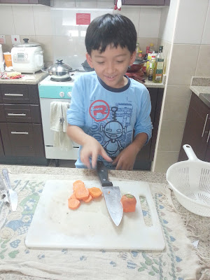 I encouraged him to try cutting the carrots using a proper knife.. and he was very nervous about it..